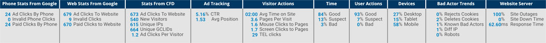 When it comes to click fraud you can never have too much information. This is why we developed the most comprehensive software and analytics in the world that focuses on identifying and blocking click fraud. What you see below is just a tiny sample of the information we gather and provide for you in your dashboard for a “single click” on your PPC Ad. There are many additional layers of information for each visitor available to you.